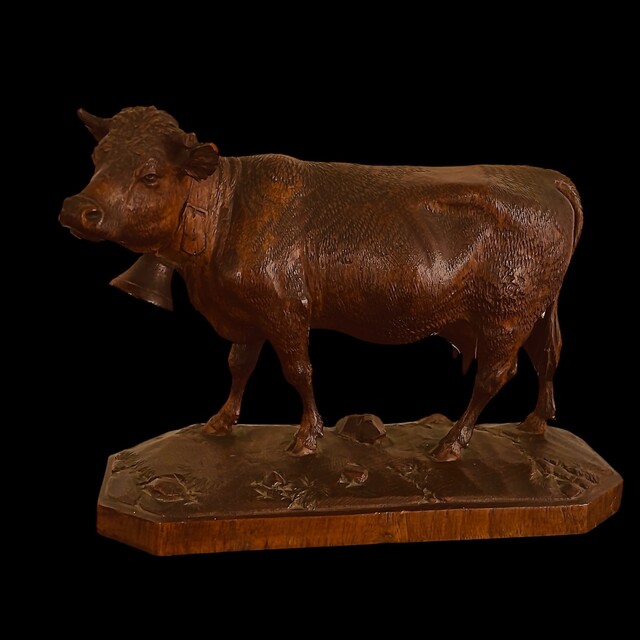 Black Forest Cow, Signed Ed Binder & Cie, Brienz, 19th Century. Carved Lindenwood with natural patina and fine detail.